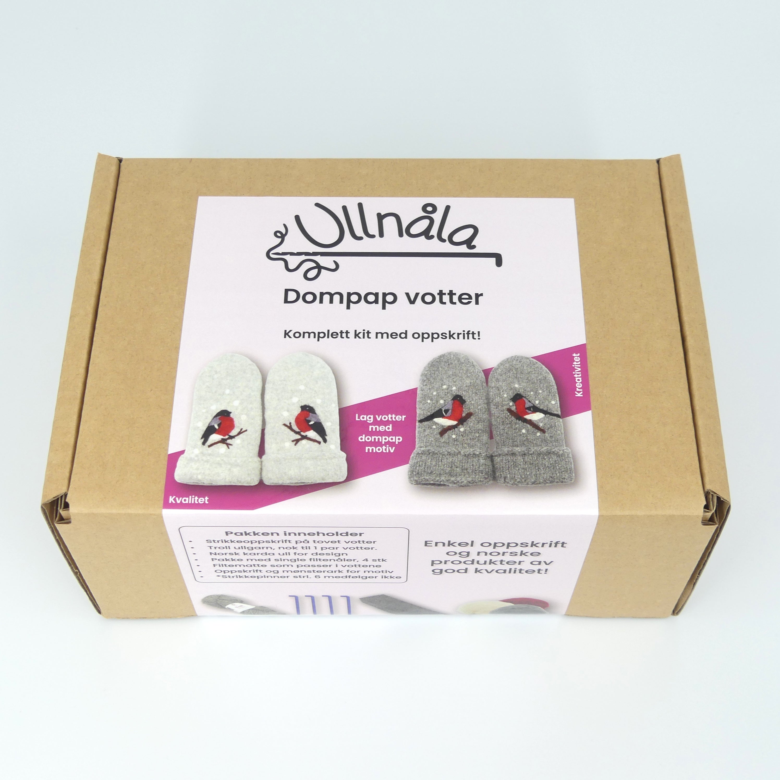 Komplett kit for å strikke dine egne flotte og tykke votter med nålefilt design av dompap!